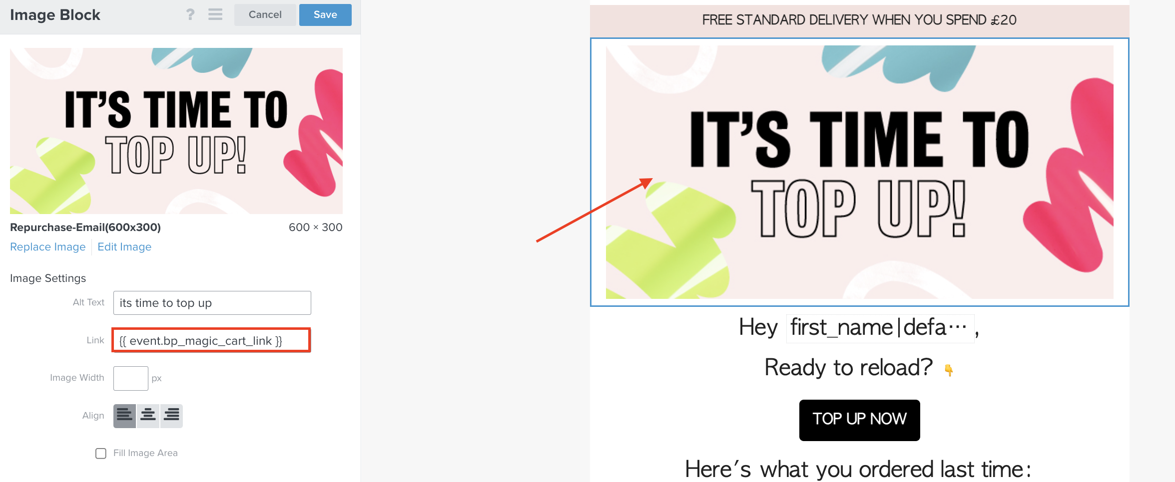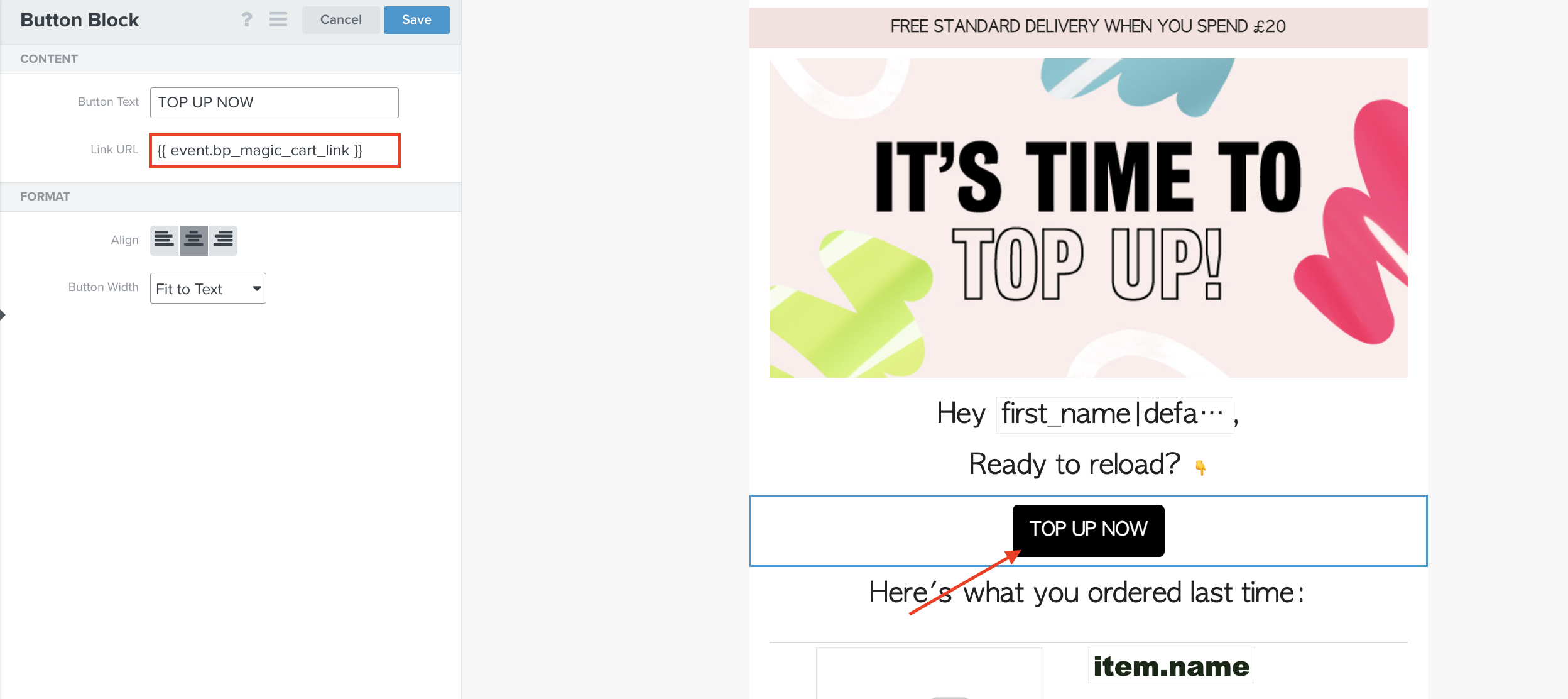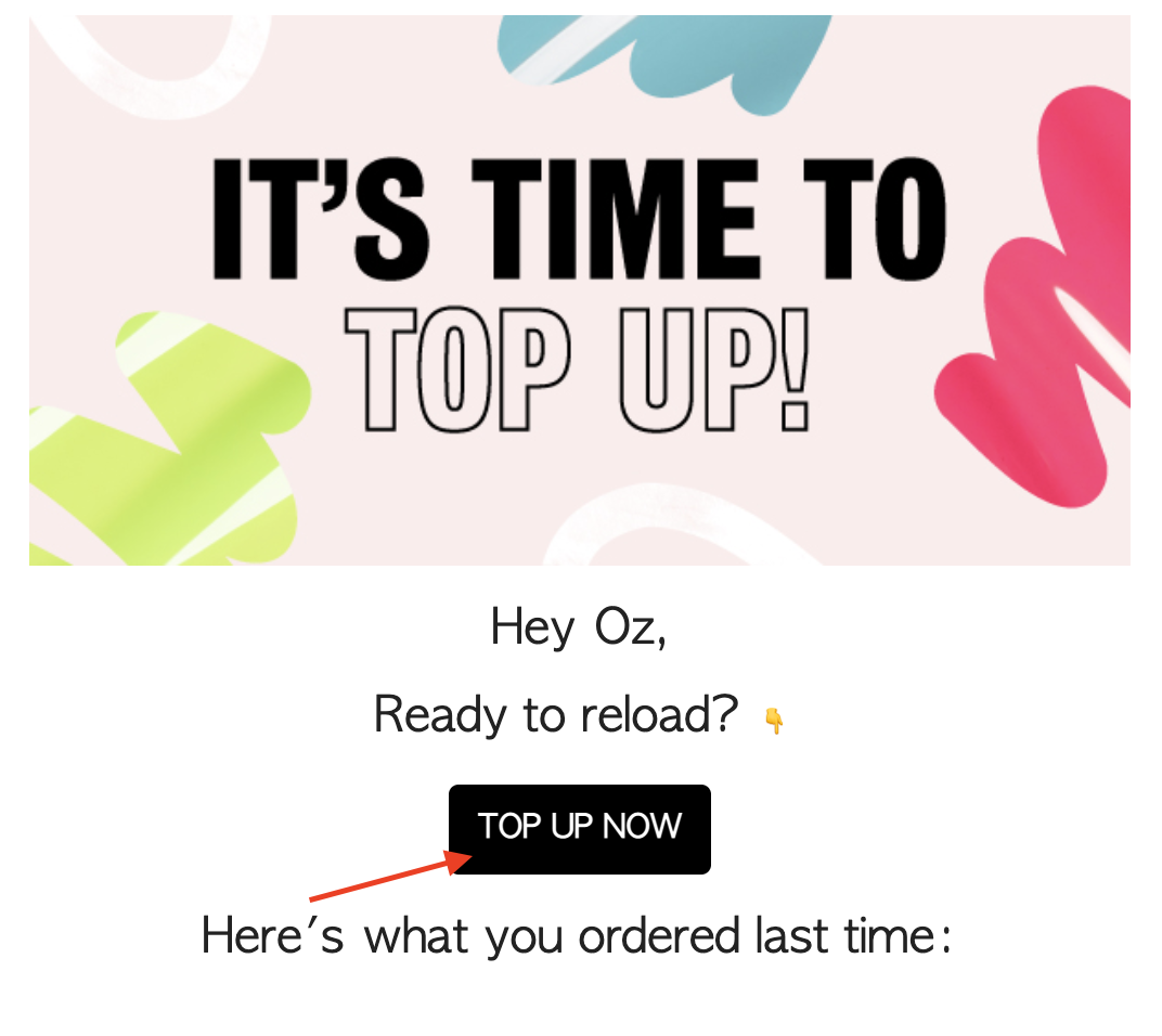 The Magic Cart creates a seamless purchasing journey whereby a customer can reorder, or add to their existing order, in just a couple of clicks. The Magic Cart is simply a URL link (personalised to that customer) that can be added to a newly created flow or existing one. For the best results, add the Magic Cart to a Repeat Buy flowby adding the URL to the call to action (CTA) in the content of that email e.g the reorder/buy again button or on the image of an item.