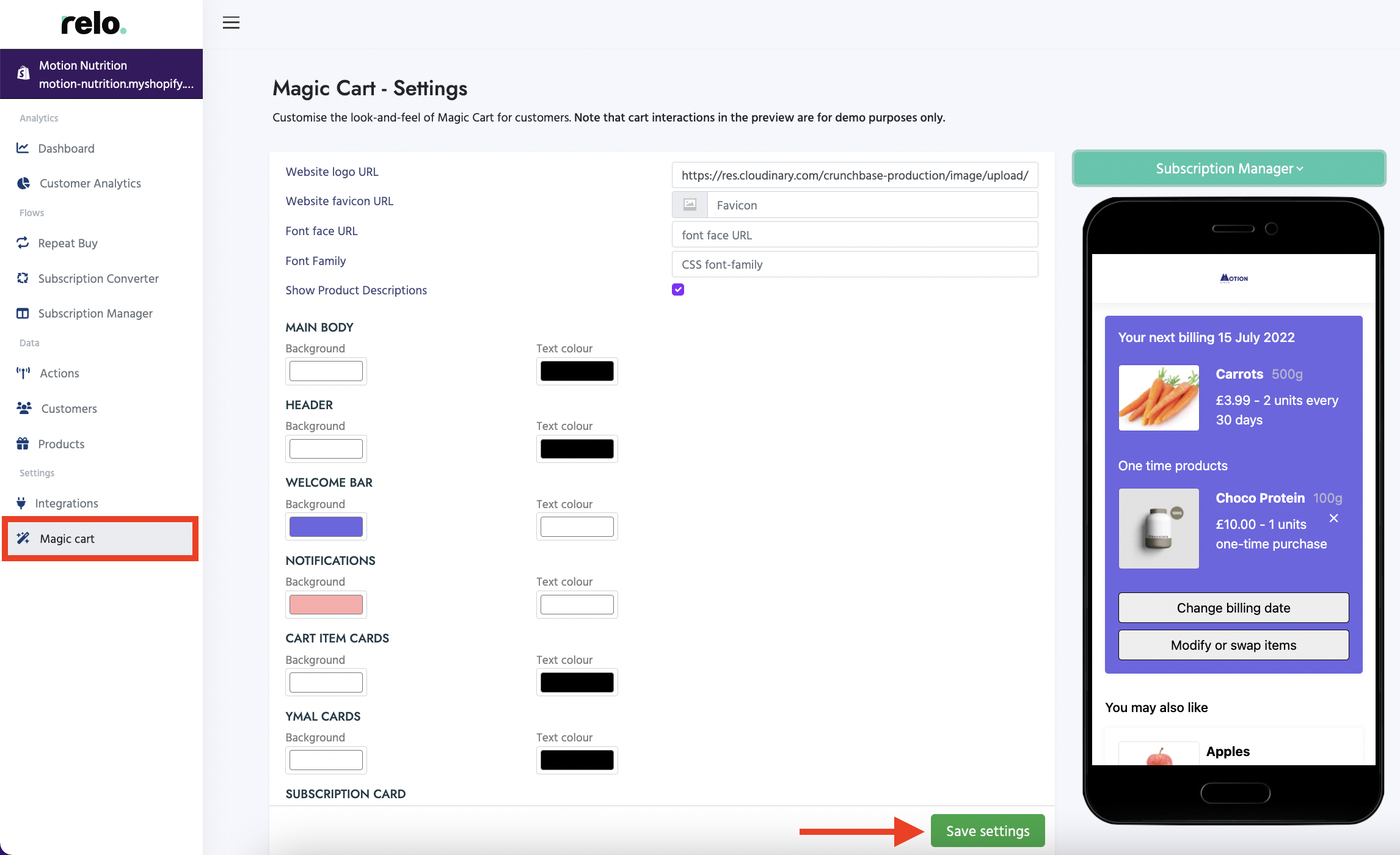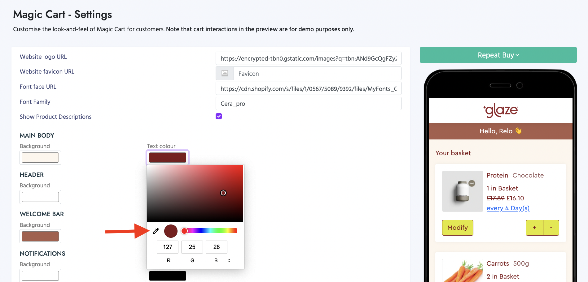 You can customise the look and feel of the Magic Cart for your customers by adding your logo and selecting on-brand colours for your text, buttons, backgrounds, footers and headers.