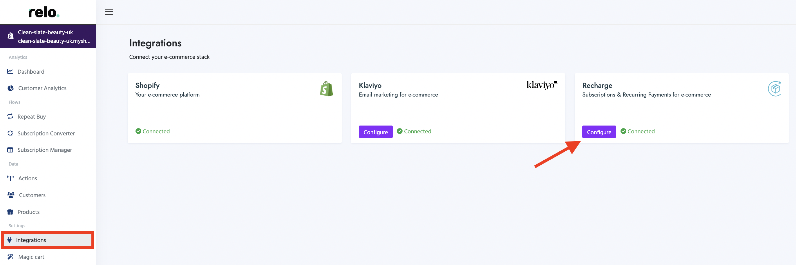 Firstly head to the Integrations Hub in your dashboard and select 'Recharge'