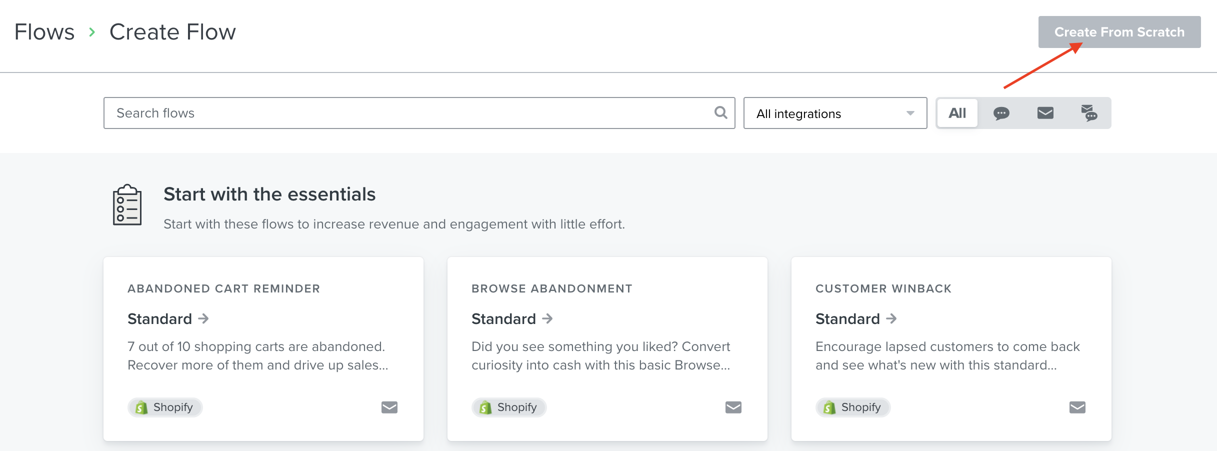 If you are creating a brand new flow, head to the Flows section and select 'Create From Scratch'. DO NOT use a pre-built Klaviyo template as the triggers cannot be edited once created unless the flow is then duplicated using these instructions.