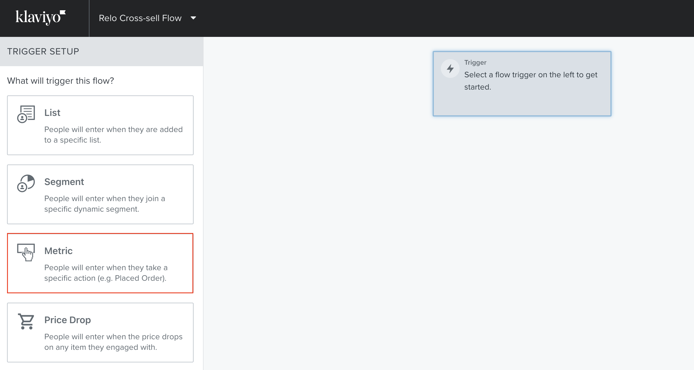 - You will need to first setup the correct flow trigger. Select 'Metric' in the lefthand list.