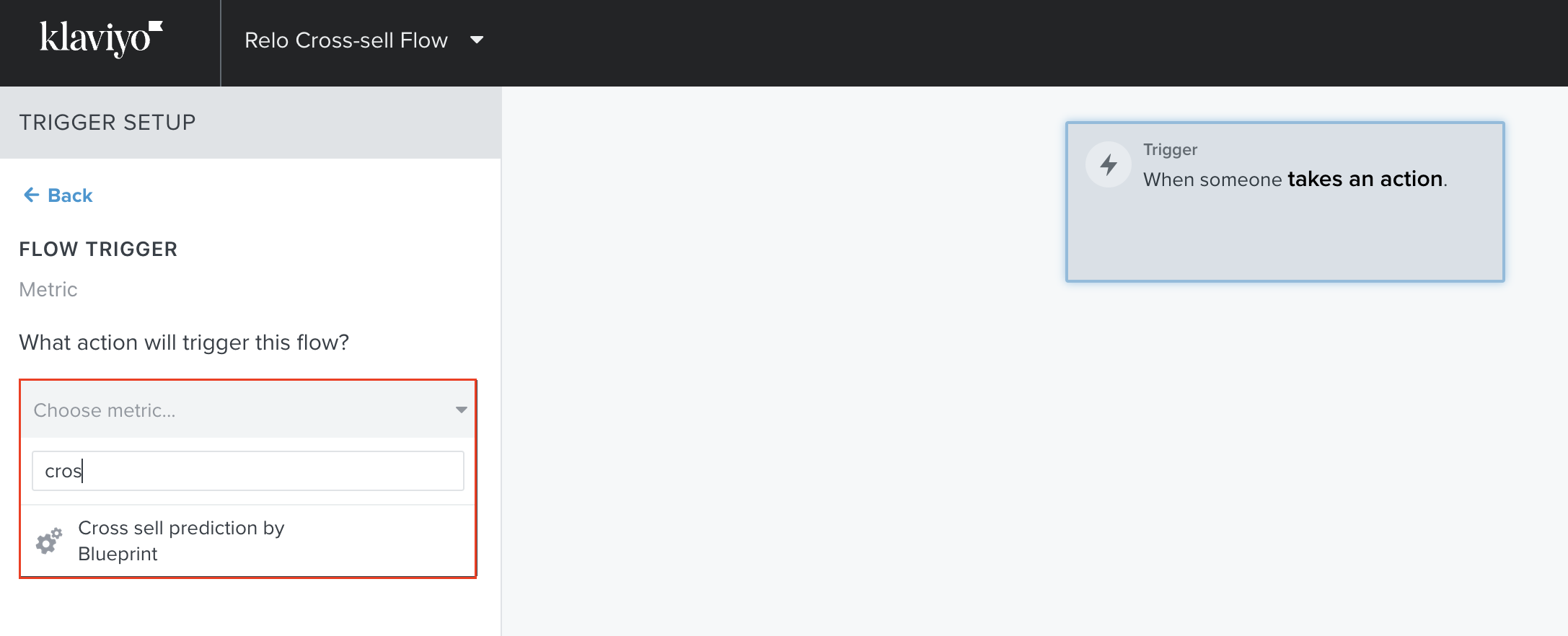 - Under 'What action will this trigger' search for 'Cross sell prediction by Blueprint' and select. Please note, if this option doesn't appear, please double check that Klaviyo is integrated in step 1.